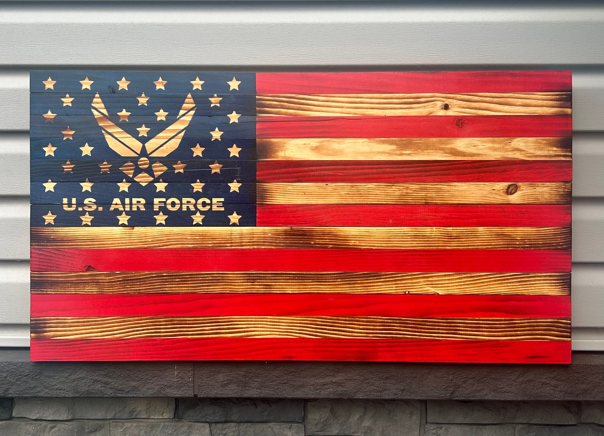 Precision-laid U.S. Air Force wings emblem set in the union—hand-torched and stained, perfect for active duty, veterans, and retirements.